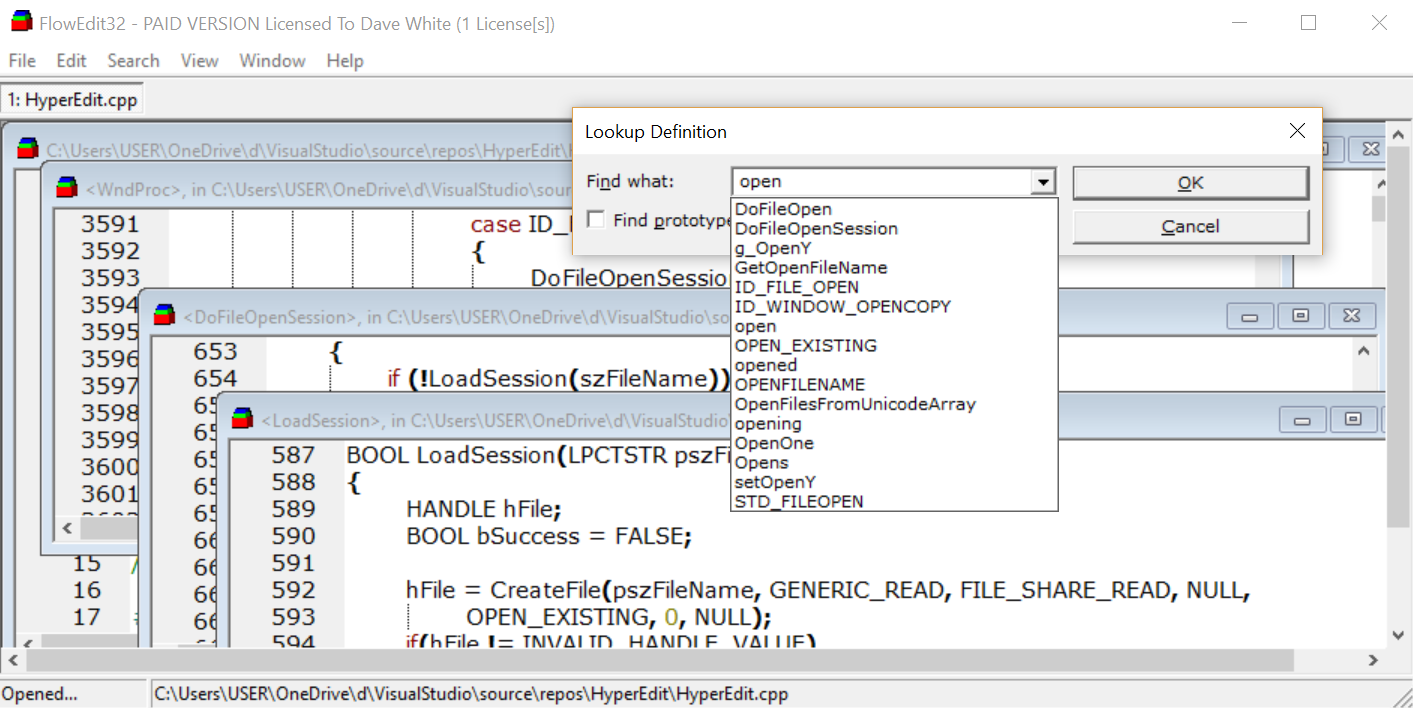 Notable features: Press F4 with your cursor on a symbol to look up the definition in any of the open files; it appears in a separate window (even if it's in the same source file-- each source file can have unlimited windows). Then you can edit or view the definition and press Esc to return where you were. This was a rare feature when I first made the editor; nowadays Visual Studio has something sort of similar but I still like HyperEdit.